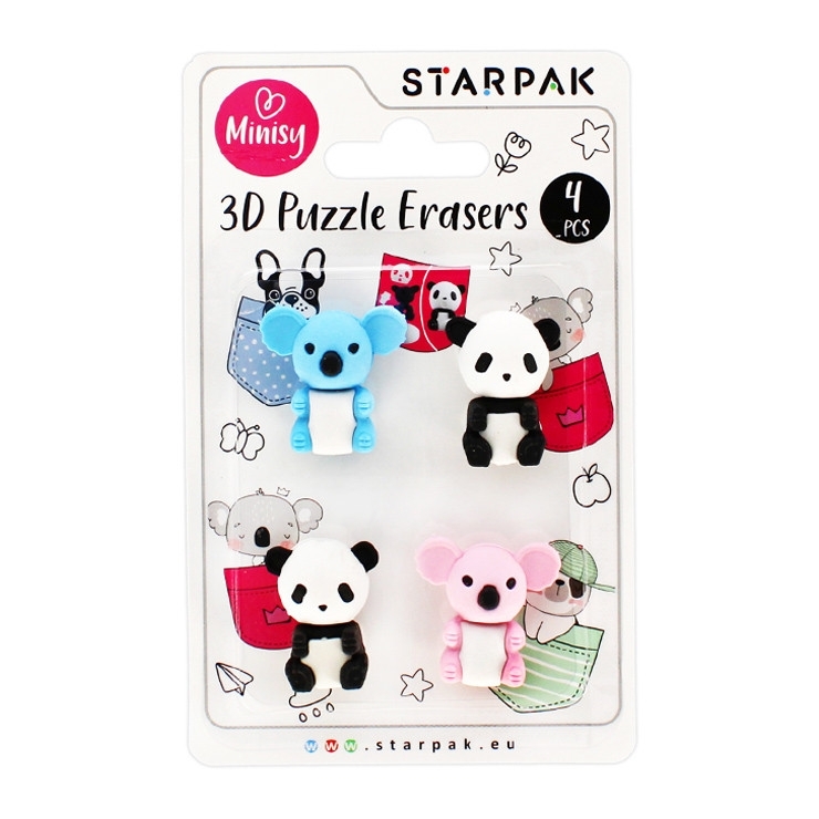 Gumy koala a panda, lze je použít i jako 3D puzzle, jednotlivé prvky se od sebe odlepují a dají se libovolně kombinovat. Obsah balení je 4 gumy. Rozměry balení jsou 10x15x3cm. Určeno pro děti ve věku: 3+.