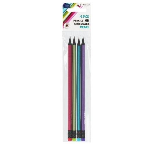 Zestaw 4 ołówków trójkątnych z gumką Pearl z kolekcji STARPAK. Każdy ołówek wykonany z trwałego drewna, zakończony gumką do mazania zapewnia komfort rysowania i pisania. Ołówek nie łamie się podczas strugania a gumka nie brudzi.