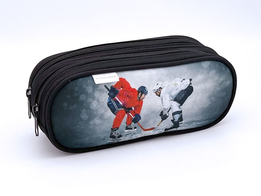 Etue CONCORDE s motivem ledního hokeje v elegantní šedé barvě nejen skvěle vypadá, ale především nabízí dostatek prostoru díky dvěma samostatným komorám. Ty jsou uzavíratelné na zip, což zajistí bezpečné uschování vašich psacích potřeb, školních nebo kancelářských pomůcek a dalších drobností.