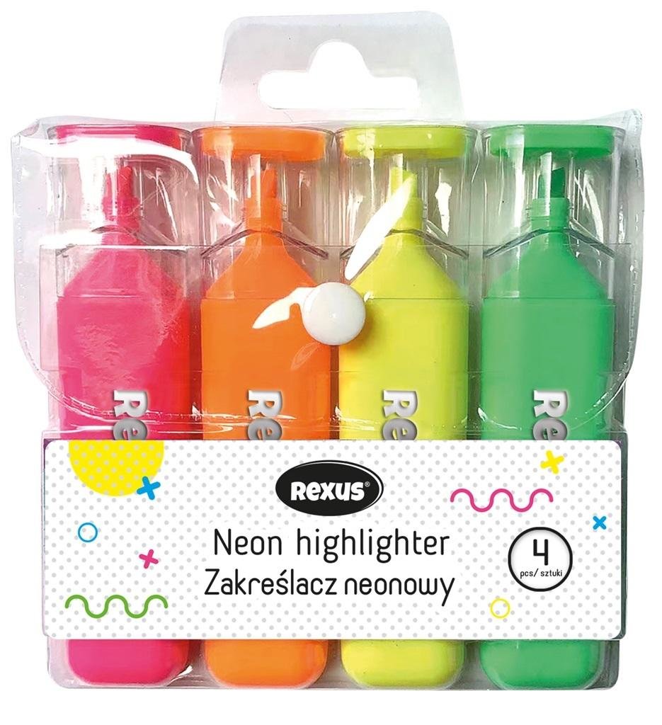 Zakreślacze w neonowych kolorach ze ściętą końcówką. Tusz jest transparentny, więc nie przysłania zaznaczonego tekstu, a jaskrawe kolory zakreślaczy przykuwają spojrzenie i wyróżniają zakreślony tekst. Doskonale sprawdzi się w szkole i na uczelni, przyspieszając proces zapamiętywania. Jest także niezawodnym narzędziem w biurze, ułatwiając organizację czasu i pracy. Kolory: cytrynowy, pomarańczowy, różowy i zielony.