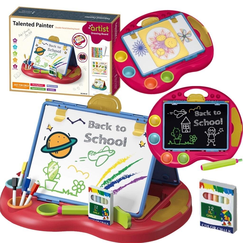 Dwustronna tablica to jedna strona z białą powierzchnią, idealną do pisania i rysowania markerami, a druga do malowania kredą, gotowa na nowe dzieła. Dzięki gąbce do wycierania dziecko może kreować, usuwać i tworzyć bez końca.