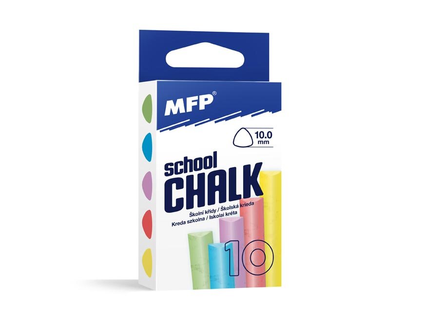 Tříhranná školní křída neprašná - různých barev. Určena pro psaní na školní tabuli, ale i pro psaní na chodník či na stěnu. Křídy jsou vysoce odolné proti lámání a zajišťují hladké psaní při použití na tabule. 2 ks oranžové křídy, 2 ks růžové křídy. Křídy jsou uloženy v papírové krabičce s euro-závěsem. Uvedená cena je za 1 balení, ve kterém se nachází 10 ks kříd.