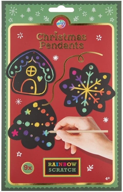 Stačí vzít přiložené škrabátko a postupně odkrývat skryté barvy - každý přívěsek se tak promění v jedinečnou ozdobu. Díky přiloženým šňůrkám je možné hotové dekorace snadno zavěsit na stromeček, do okna nebo použít jako originální dárek.