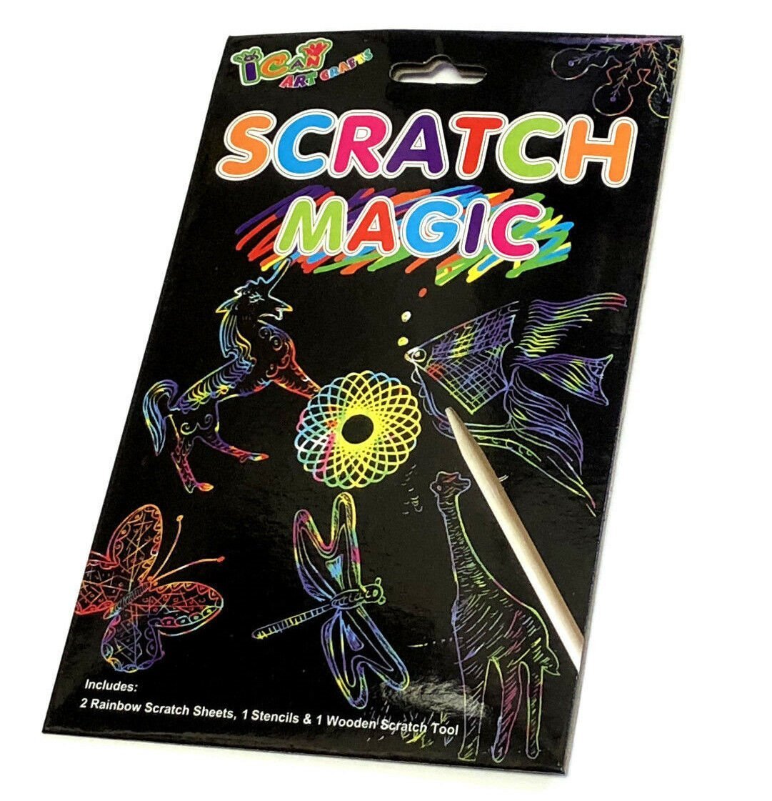 Sada obsahující dva škrabací nepotištěné listy pro volné tvoření, papírovou šablonku a dřevěný škrabací stylus. Škrabací obrázky probouzí kreativitu a nadšení a nejen malé výtvarníky zaměstnají na dlouhé hodiny. Papír je potažený černou vrstvou skrývající podklad s duhovým efektem. Obsah balení: 2 obrázky s barevnou vrstvou (rozměry 15,5 x 11,5 cm) 1 arch s šablonami * dřevěné škrabací pero Variantu šablonek dodáváme dle skladových zásob.