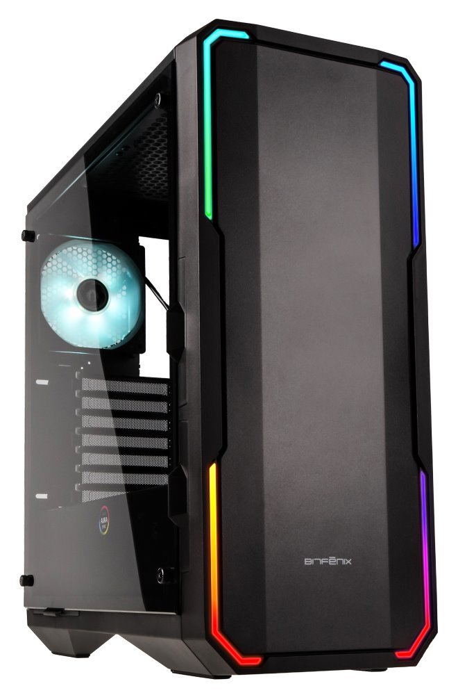 Moderní počítačová skříň s průhlednou bočnicí z temperovaného skla. Formát Middle Tower nabízí dostatek prostoru pro uložení až pěti disků, základní desky do velikosti ATX a až šesti ventilátorů. Předinstalovány jsou dva 120 mm ventilátory, z toho jeden s adresovatelným RGB podsvícením. Na horním panelu se nachází dva porty USB 3.0, sluchátkový výstup, audio vstup pro mikrofon a tlačítko pro rychlou změnu podsvícení. Ve skříni je dostatek prostoru pro chladič CPU do výšky až 160 mm a grafickou kartu o délce až 340 mm. Důmyslné řešení umožňuje pohodlné umístění až 280 mm dlouhého výměníku vodního chlazení na přední straně. Skříň je dodávána bez zdroje. Součástí skříně je také sada prachových filtrů.