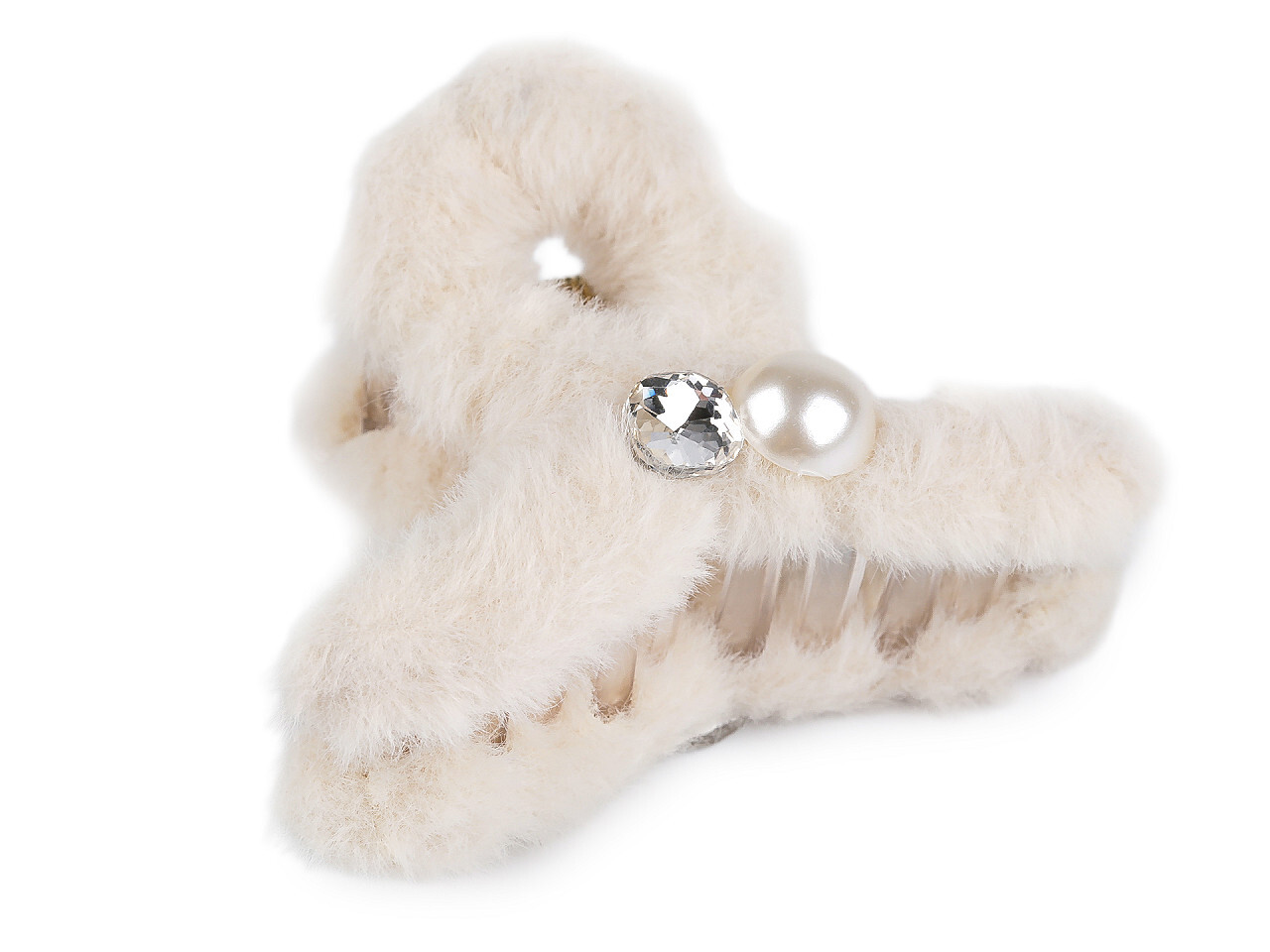 Skřipec do vlasů kožešinový s perlou a broušeným kamenem - 1 ks - 2 béžová světlá