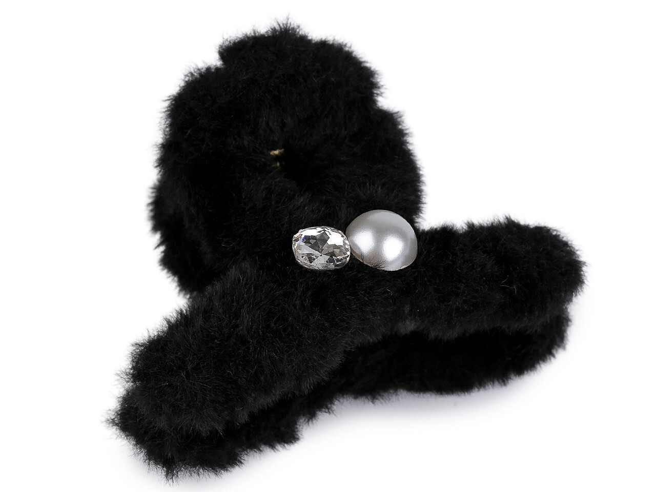 Skřipec do vlasů kožešinový s perlou a broušeným kamenem - 1 ks - 6 černá
