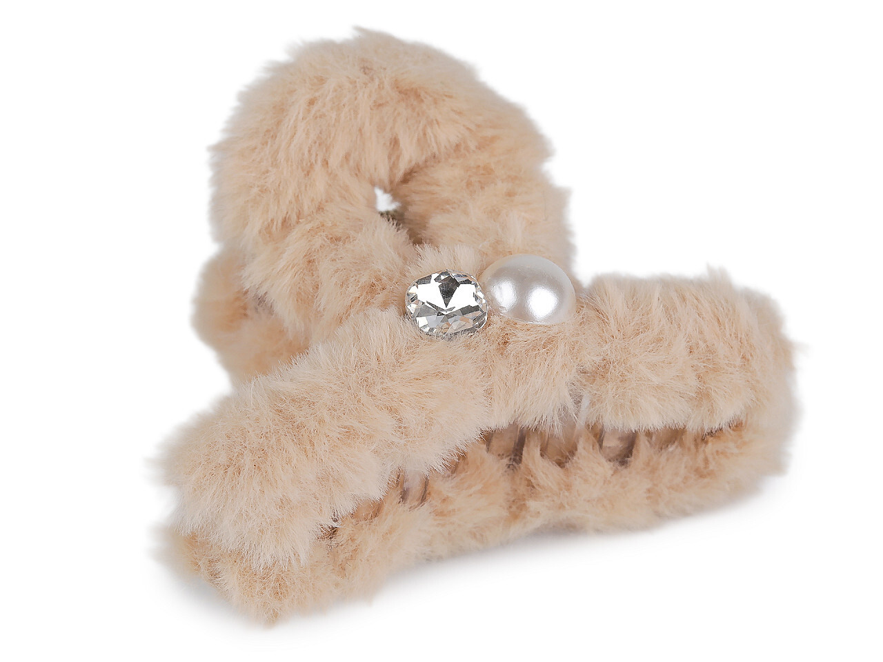 Skřipec do vlasů kožešinový s perlou a broušeným kamenem - 1 ks - 3 béžová
