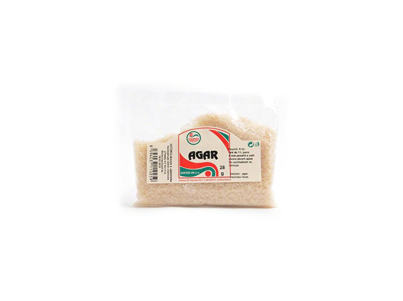 Rostlinná želatina Agar - Přírodní mořský produkt, který se používá k přípravě ovocných rosolovacích polev na dorty, řezy a cukroví. Výrobek z mořských řas, který neobsahuje žádné další příměsi. Agar nebo-li rostlinná želatina se vyrábí z některých druhů mořských řas. Agáru je oblíbená, zdravá pochoutka, neboť obsahuje mnoho blahodárných látek, vitamínů a bílkovin. Obsahuje například jód, vápník, železo.Obsah: 28gZemě původu: Japonsko