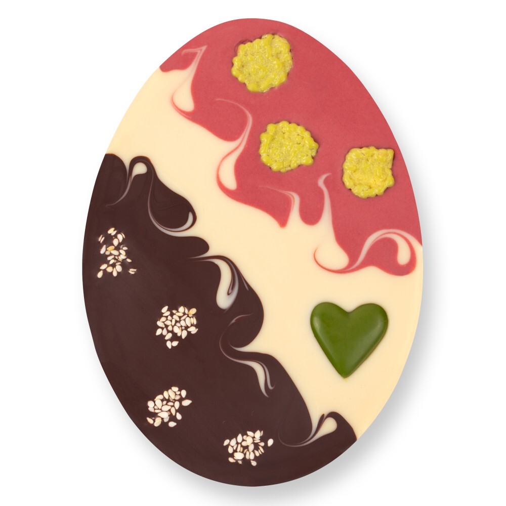 Nádherné čokoládové vajíčko ve veganské verzi vyrobené z růžové malinovo-kokosové polevy, čisté bílé rýžové polevy a hořké čokolády se 70 % fair trade kakaa. Zdobí ho čokoládové srdíčko ze zeleného čaje, křupavé kukuřičné vločky a pražená sezamová semínka. Všechny ty jasné barvy jsou přitom tvořeny výhradně přirozeně z použitých malin, zeleného čaje, kukuřice a kakaa. To vše je zabaleno do pěkné dekorativní krabičky, která už sama o sobě slouží jako dárkové balení.