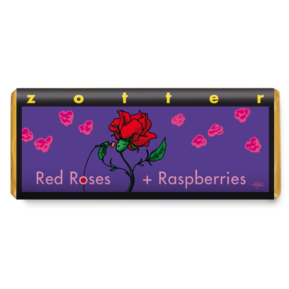 Zotter Bio plněná mléčná čokoláda Červené růže a maliny, 70 g