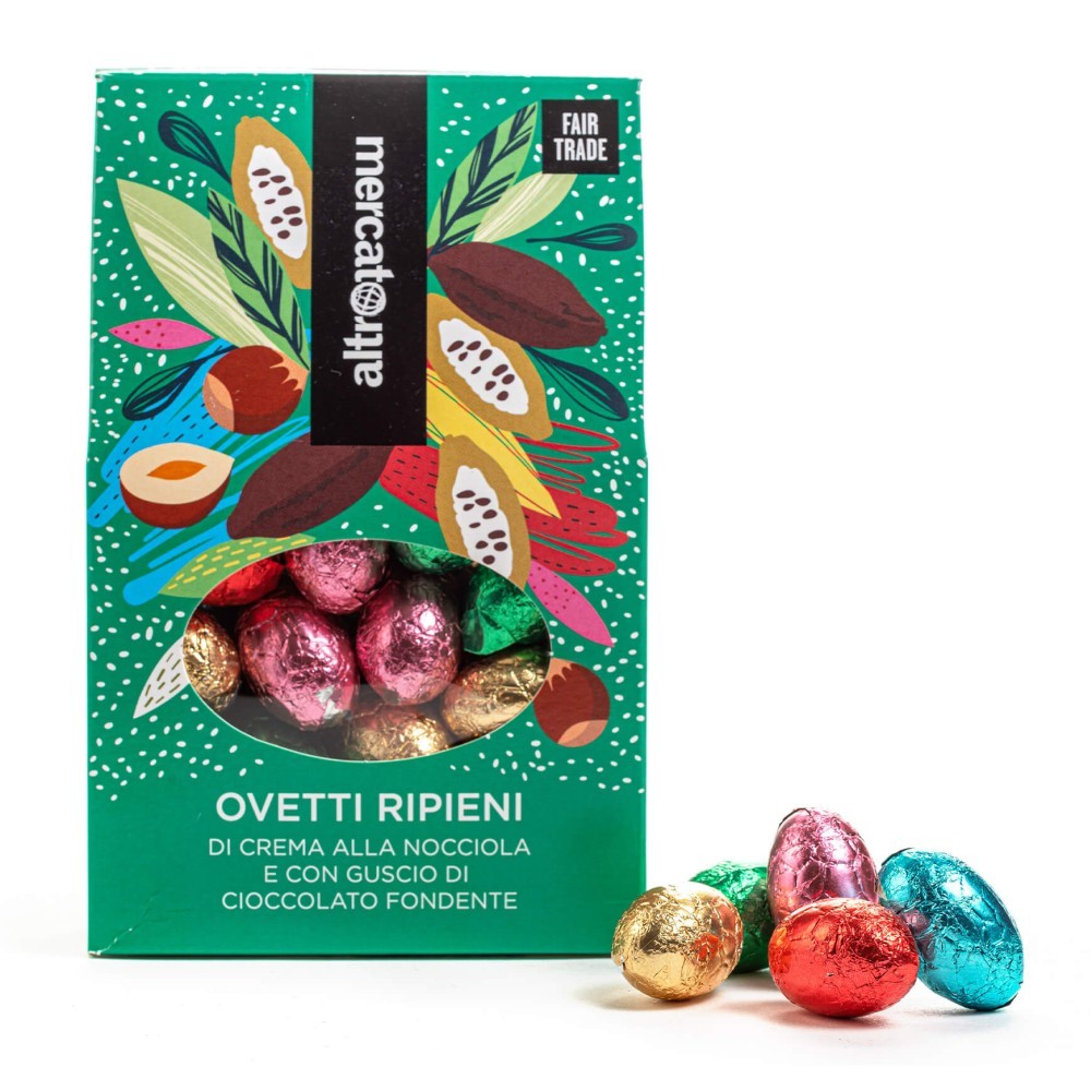 Krásná malá velikonoční vajíčka balená do alobalu několika různých sytých barev. Skořápku asi 30 lahodných vajíček tvoří jemně hořká čokoláda s 60 % fair trade kakaa ze Sierry Leony. Jejich měkká srdce pak téměř z poloviny vyplňuje krém z lískových oříšků. Tyto malé dobroty jsou skvělé ke sdílení s blízkými a koledníky a znamenají i spravedlivější budoucnost pro všechny.