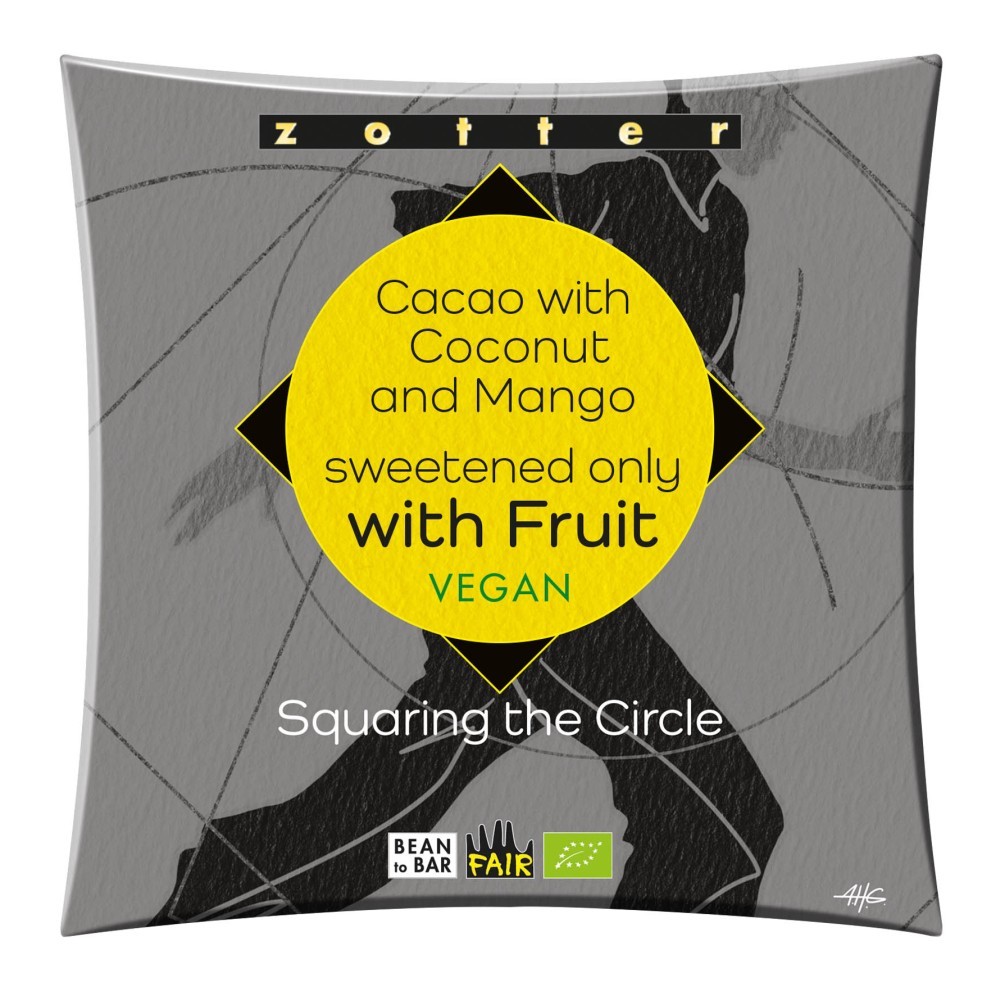 Tvar čokolády odkazuje na známý geometrický problém kvadratury kruhu. Stejně jako tato "neřešitelná" úloha se dlouho jevila i snaha uvařit sladkou čokoládu bez klasického cukru. Mistr Josef Zotter to však v této čokoládové delikatese dokázal a jako čtverec vepsaný do kruhu, vetkl do této čokolády přirozenou a přírodní sladkost ovoce.