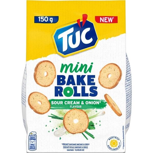 Slané krekry Tuc Bake Rolls mini - suchary typické svým kulatým tvarem s dírkou uprostřed, s příchutí kysané smetany a cibule;