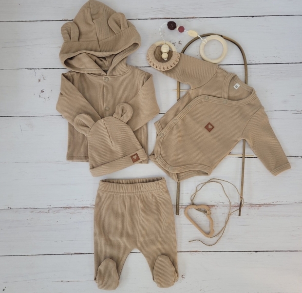 Sada do porodnice 4D, žebrovaná, body, polodupačky, kabátek a čepička, béžová, vel.62; 62 (2-3m)