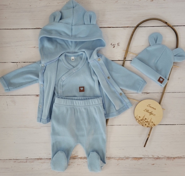 Sada do porodnice 4D, žebrovaná, body, polodupačky, kabátek a čepička, modrá; 50 (0-1m)