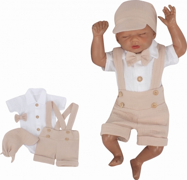 Mušelínové kraťasy s láclem, bodýčko, čepička, motýlek 4D sada, Z&Z, písková/bílá, vel. 68; 68 (3-6m)