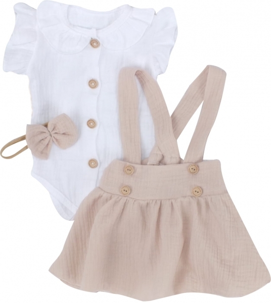 Mušelínová suknička s láclem, bodýčko a čelenka, 3D sada , bílá/béžová, vel. 68; 68 (3-6m)