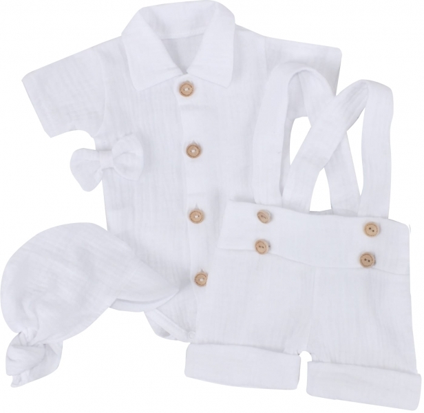 Mušelínové kraťasy s láclem, bodýčko, čepička, motýlek 4D sada, Z&Z, bílá/bílá, vel. 68; 68 (3-6m)