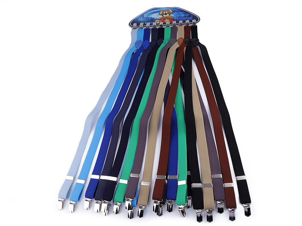 Dětské šle o délce 80 cm a šířce 2,5 cm. Jde o kvalitní tkaný český výrobek. Šle jsou vyrobené ze 75% polyesteru a 25% elastodienu. Originální balení obsahuje 10 ks šlí v náhodném barevném mixu. Vhodné jsou pro kluky i děvčata. Přichycují se pomocí kovových žabek obdélníkového tvaru.