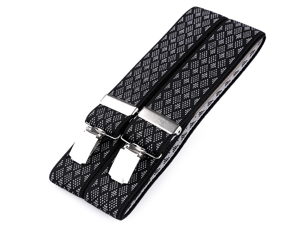 Tyto šle jsou vyrobeny z elastického materiálu, který zajišťuje pohodlné nošení po celý den bez nepříjemného tlačení. Jejich klasický vzor s drobnými kosočtverci dodává decentní, avšak výrazný vzhled. Zadní vsadka z ekologické kůže přidává nádech originality a pevnosti. Připevnění ke kalhotám na tři kovové žabky - dvě vpředu a jednu vzadu - garantuje, že vše drží pevně na svém místě.