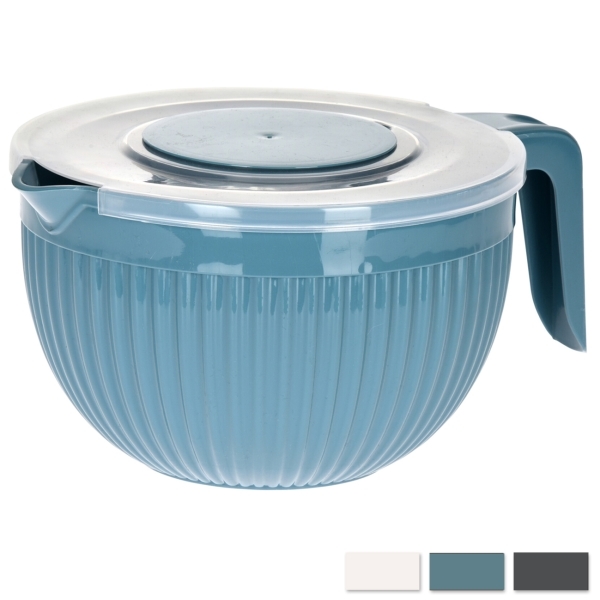 Šlehací mísu s víčkem a výlevkou oceníte při šlehání piškotového těsta, krémů, pomazánek, šlehačky, sněhu. Bude se Vám s ní pracovat mnohem pohodlněji než s běžnými nádobami a to díky systému dvojdílného víčka. Při šlehání odklopíte pouze středovou část, uvolní se tak prostor pro šlehací metly, ale po okrajích víčko zůstane a chrání tak Vaši kuchyň před nežádoucím rozstřikováním šlehaných potravin. Přiklopením středové části víčka pak zabráníte osychání ušlehaných dobrot. Mísa je opatřena výlevkou a uchem, takže se s ní velmi pohodlně pracuje. Mix barev. Materiál: plast. Rozměry: objem 3,5 l, výška 14 cm, pr. 22,5 cm. Vhodná do myčky.