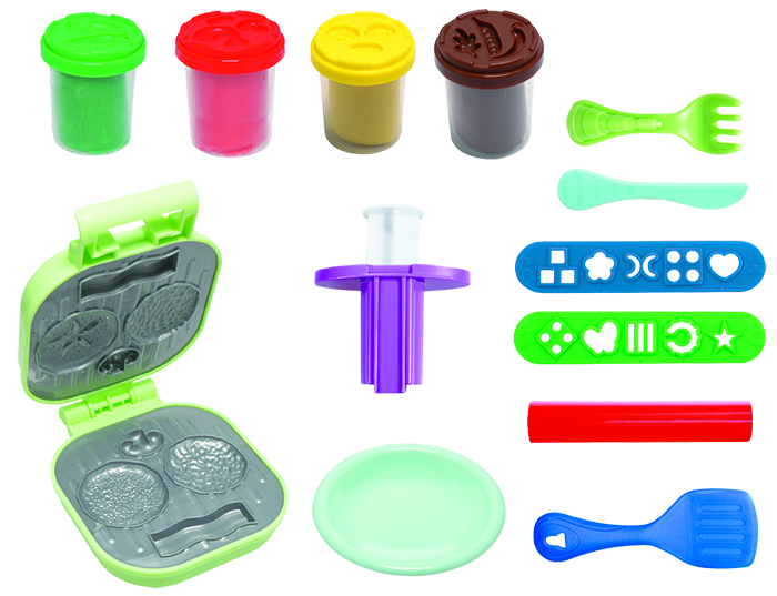 Modelína, ve které jsou různá tvořítka a formičky na výrobu hamburgeru. Včetně modelovací hmoty. číst celé