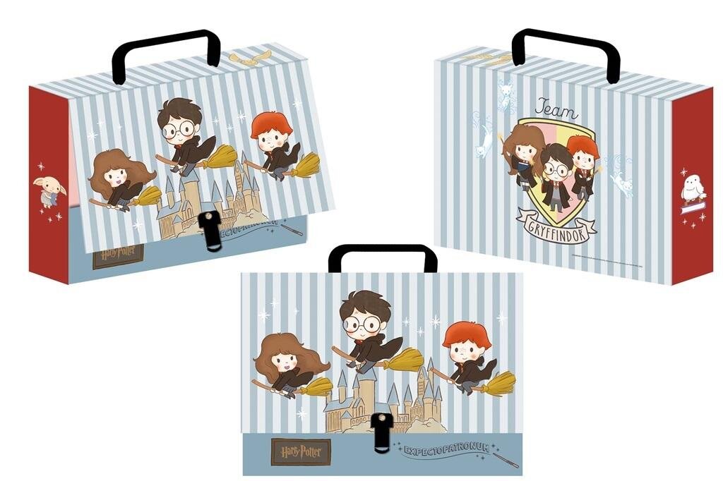 Teczka walizeczka - kartonowa/sztywna teczka z rączką, zapinana plastikowym mechanizmem z przodu. Doskonała dla przechowywania i przenoszenia zeszytów, brulionów, dokumentów, zdjęć, bloków rysunkowych, kredek i wielu innych. Kolorowa na zewnątrz, pokryta połyskową folią, wewnątrz zadruk w jednym kolorze dopasowany kolorystycznie do zewnętrznej części teczki. Motyw z serii Harry Potter