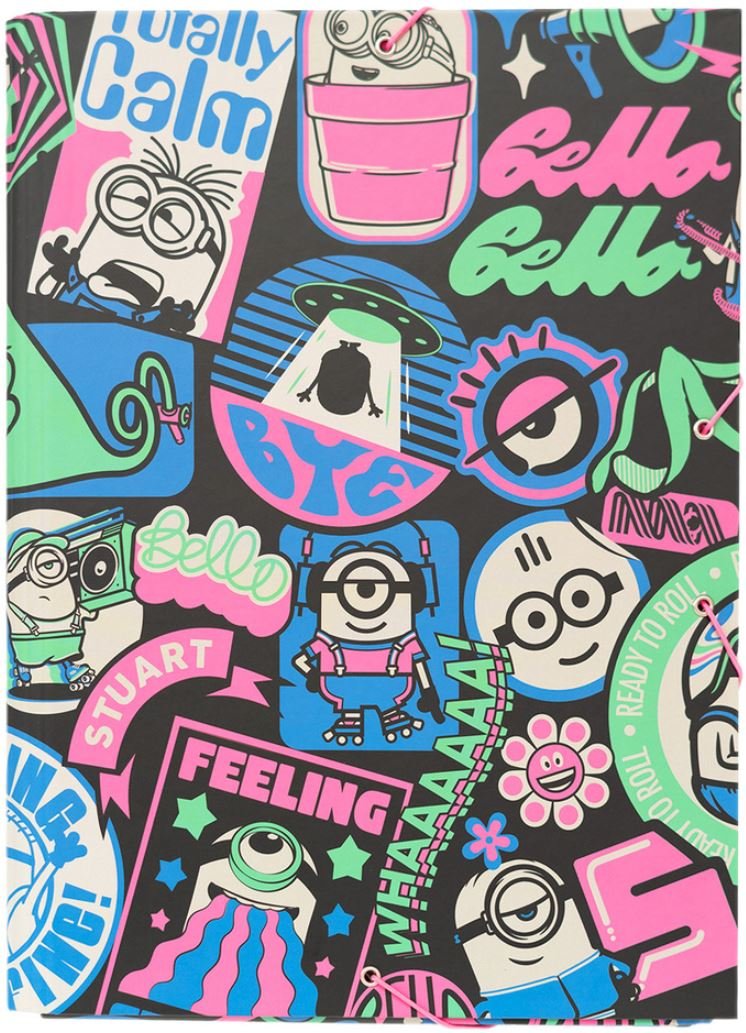 Složka na sešity velikosti A4 s 3 klopami a stahovací gumou vyrobená v motivu Totally Calm (Úplně v klidu) s licencí Mimoni.