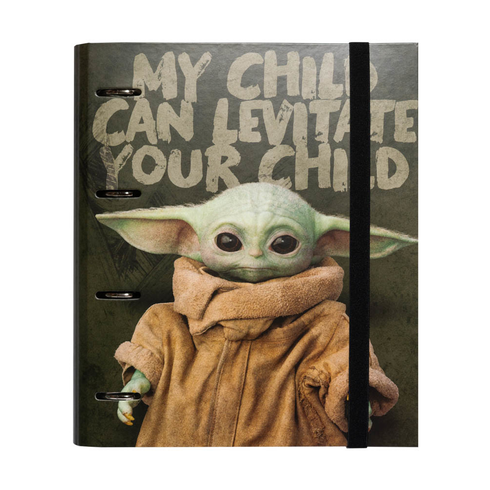 4 kroužkový pořadač inspirovaný seriálem postavičkou Baby Yoda ze seriálu The Mandalorian (Hvězdné války). Pořadač má stahovací pásek, který slouží proti nechtěnému otevření.