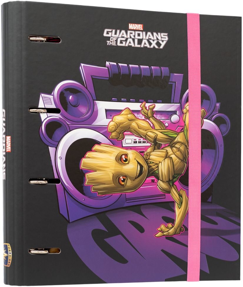 Kroužkový pořadač s grafikou postavy Groot z populární filmové série Guardians of galaxy (Strážci galaxie) a s licencí Marvel. Pořadač ve formátu A4 se 4 kroužky a gumičkou.