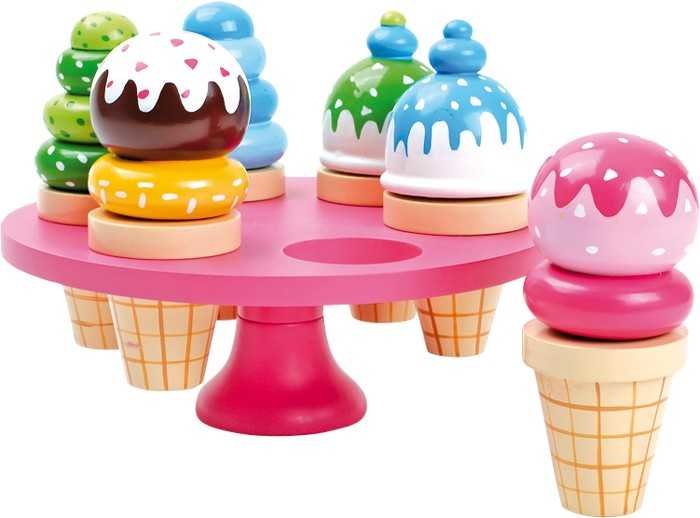 Směsici barevných zmrzlin nabízí tento růžový stojan na zmrzliny ze dřeva. Barevné kornoutky lze snadno zavěsit do kulatých otvorů a každé dítě si může jednu vzít. Kopečky zmrzliny se nasazují na kolík umístěný ve středu kornoutku. Kopečky zmrzlin lze mezi sebou kombinovat. Německá firma Legler zaměřená na výrobu kvalitních dřevěných hraček od roku 1996. Všechny dřevěné hračky značky small foot mají označení CE a jsou vyráběny dle evropské normy pro bezpečnost hraček EN 71. Použité barvy jsou speciálně vyvinuty pro dřevěné hračky a jsou odolné i proti slinám dětí. Dřevo, které se používá pro tyto hračky, většinou pochází z lesnických společností zapojených do zalesňování. To nabízí všem zákazníkům možnost přispět k zachování přirozeně rostoucích lesů. Dřevěné hračky small foot jsou zářivě barevné produkty, které jsou vyrobeny převážně z přírodních surovin - dřeva. Dětem dělají radost od útlého věku, rozvíjí jejich hmatové a smyslové dovednosti. Cílem značky small foot je podporovat duševní a fyzický vývoj dětí.