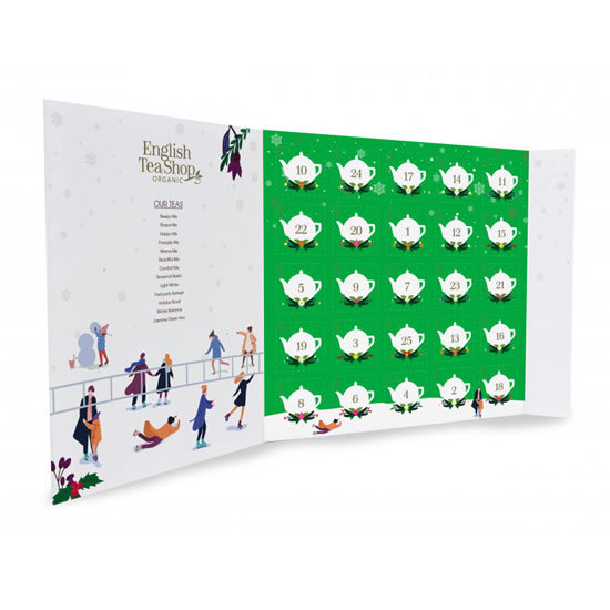 Adventní kalendář ve tvaru knihy, 25 pyramidek sypaných čajů, 13 příchutí Perníčkové pohoštění - Bio černý čaj se skořicí, zázvorem, jablkem a kardamonem Složení: Bio černý čaj (53%), bio skořice (17%), bio zázvor (15%), bio jablko (6%), bio kardamon (5%), bio příchuť a aroma (4%). Božsky zelený - Bio zelený čaj se skořicí, zázvorem, mátou peprnou a okvět plátky růže Složení: Bio zelený čaj (73%), bio kousky skořice (14%), bio kousky zázvoru (5%), přírodní příchuť a aroma (3%), bio listy máty (4%), bio okvět plátky růže (1%). Bílá snová krajina - Bio bílý čaj se skořicí, kakaem, mátou peprnou, lékořicí a heřmánkem Složení: Bio bílý čaj (75%), bio kakao (4.75%), přírodní příchuť a aroma (4.25%), bio skořice (4%), bio listy máty peprné (4%), bio lékořice (4%), bio heřmánek (4%) Obsahuje lékořici - osoby trpící hypertenzí by se měly vyvarovat nadměrné konzumace Sváteční koření - Bio černý čaj se skořicí, pomerančem, zázvorem, kardamonem, hřebíčkem, muškát oříškem a pepřem Složení: Bio černý čaj (74%), přírodní příchuť a aroma (4.5%), bio skořice (5%), bio pomerančová kůra (4%), bio zázvor (2.5%), bio kardamon (2.5%), bio hřebíček (2.5%), bio muškát oříšek (2.5%), bio pepř (2.5%). Zimní zahřívač - Bio rooibosovo-bylinkový čaj se zázvorem, kakaem, anýzem a muškát květem. Složení: Bio rooibos (60.5%), bio kousky zázvoru (15%), bio kakao (10.5%), bio anýz (5%), bio muškát květ (4%) přírodní příchuť a aroma (5%). Super Anýz - Bio černý čaj se zázvorem, hřebíčkem a anýzem. Složení: Bio černý čaj (83%), bio zázvor (6%), přírodní příchuť a aroma (5%), přírodní hřebíček (4%), bio anýz (badyáník pravý) (2%). Tropická citronová tráva - Bio bylinkový čaj s citronovou trávou, mátou peprnou, ibiškem, šípkem, heřmánkem a jablkem. Složení: Bio citronová tráva (24%), bio listy máty peprné (20%), bio ibišek (20%), bio šípek (11%), bio heřmánek (10%), bio jablko (10%), přírodní příchuť a aroma (5%). Šťastné vánoce - Bio zelený čaj se zázvorem, granát jablkem, zázvorem, kardamonem, hřebíčkem, muškát oříškem a pepřem. Složení: Bio zelený čaj (83%), přírodní příchuť a aroma (5%), bio skořice (2.5%), bio granát jablko (2%), bio zázvor (1.5%), bio kardamon (1.5%), bio hřebíček (1.5%), bio muškát oříšek (1.5%), bio pepř (1.5%). Osvěžení po oslavách - Bio zelený čaj se skořicí, Garcinií a ovocem acai Složení: Bio zelený čaj (64%), bio skořice (13%), bio listy garcinie (12%), bio ovoce garcinia (5%), přírodní příchuť a aroma (5%), bio ovoce acai (1%). Náboj Chai-e - Bio bylinko-rooibosový čaj se skořicí, hřebíčkem, kurkumou, kardamonem, česnekem a chrpou Složení: Bio rooibos (56%), bio skořice (15.75%), bio hřebíček (12%), bio kurkuma (6%), přírodní příchuť a aroma (4.25%), bio kardamon (4%), bio česnek (1%), bio chrpa polní (1%). Silná broskev - Bio ibiško-bylinkový čaj se šípkem, citronem, citronovou trávou, skořicí a jablky Složení: Bio ibišek (55%), bio šípek (20%), bio citronová kůra (5%), bio citronová tráva (5%), bio skořice (5%), bio jablko ( 5.5%), přírodní příchuť a aroma (4.5%). Sváteční povzbuzení - Bio bylinko-šípkový čaj s ibiškem, jablkem, lékořicí, skořicí a plátky růže Složení: Bio šípek (38%), bio ibišek (18%), bio listy máty peprné (12%), bio jablko (12%), bio lékořice * (8%), bio skořice (7%), přírodní příchuť a aroma (4%), bio plátky růže (1%). Obsahuje lékořici - osoby trpící hypertenzí by se měly vyvarovat nadměrné konzumace. Zimní rovnováha - Bio bylinko-mátový čaj s mátou klasnatou, pískavicí, bezovým květem, kurkumou, citronem, fenyklem a rozmarýnem Složení: Bio listy máty (30.5%), bio máta klasnatá (18%), bio pískavice (12%), bio bezový květ (9%), bio kurkuma (9%), bio citronová kůra (7%), bio fenykl (7%), přírodní příchuť a aroma (4.5%), bio rozmarýn (3%). Složení: Bio černý čaj (53%), bio skořice (17%), bio zázvor (15%), bio jablko (6%), bio kardamon (5%), bio příchuť a aroma (4%). Božsky zelený - Bio zelený čaj se skořicí, zázvorem, mátou peprnou a okvět plátky růže Složení: Bio zelený čaj (73%), bio kousky skořice (14%), bio kousky zázvoru (5%), přírodní příchuť a aroma (3%), bio listy máty (4%), bio okvět plátky růže (1%). Bílá snová krajina - Bio bílý čaj se skořicí, kakaem, mátou peprnou, lékořicí a heřmánkem Složení: Bio bílý čaj (75%), bio kakao (4.75%), přírodní příchuť a aroma (4.25%), bio skořice (4%), bio listy máty peprné (4%), bio lékořice (4%), bio heřmánek (4%) Obsahuje lékořici - osoby trpící hypertenzí by se měly vyvarovat nadměrné konzumace Sváteční koření - Bio černý čaj se skořicí, pomerančem, zázvorem, kardamonem, hřebíčkem, muškát oříškem a pepřem Složení: Bio černý čaj (74%), přírodní příchuť a aroma (4.5%), bio skořice (5%), bio pomerančová kůra (4%), bio zázvor (2.5%), bio kardamon (2.5%), bio hřebíček (2.5%), bio muškát oříšek (2.5%), bio pepř (2.5%). Zimní zahřívač - Bio rooibosovo-bylinkový čaj se zázvorem, kakaem, anýzem a muškát květem. Složení: Bio rooibos (60.5%), bio kousky zázvoru (15%), bio kakao (10.5%), bio anýz (5%), bio muškát květ (4%) přírodní příchuť a aroma (5%). Super Anýz - Bio černý čaj se zázvorem, hřebíčkem a anýzem. Složení: Bio černý čaj (83%), bio zázvor (6%), přírodní příchuť a aroma (5%), přírodní hřebíček (4%), bio anýz (badyáník pravý) (2%). Tropická citronová tráva - Bio bylinkový čaj s citronovou trávou, mátou peprnou, ibiškem, šípkem, heřmánkem a jablkem. Složení: Bio citronová tráva (24%), bio listy máty peprné (20%), bio ibišek (20%