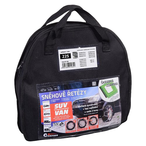 Sněhové řetězy vyvinuté přímo pro vozy SUV, s velmi snadnou a rychlou montáží i demontáží. Lze použít i pro dodávky a obytná vozidla. Čtyřhranné články 27 x 16 mm jsou uzpůsobeny proti protáčení řetězu, čímž výrazně zvyšují záběr kola. Síla materiálu 4,5 mm zajišťuje vysokou pevnost, odolnost a dlouhou životnost. Řetězová síť je uspořádána ve speciálním tvaru „X“, zaručujícím klidnou a pohodlnou jízdu na zasněžených silnicích i na polních cestách. Uvnitř balení je navíc dárek zdarma, v podobě třístranné škrabky, na vodu, led a sníh. Tabulka použití sněhových řetězů SUV-VAN ke stažení zde (formát PDF).