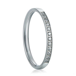 Dámský ocelový prsten jednoduchého designu s lesklým povrchem a pruhem zirkonů čiré barvy