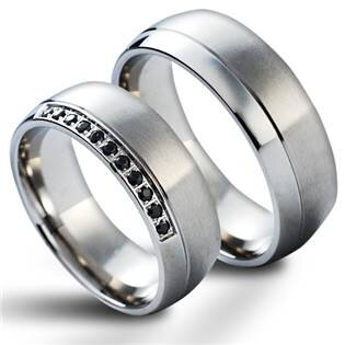 Ocelové snubní prsteny vyrobené v kombinace lesklé a matné chirurgické oceli. Dámský prsten je zdoben 11ti kubickými zirkony černé barvy
