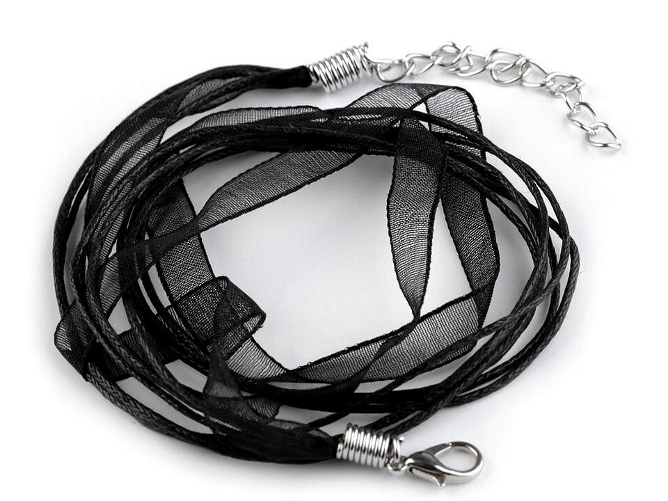 Hotový závěs z organzové stužky a tří voskovaných šňůrek je velice oblíbený. Stačí na něj zavěsit koupený nebo vlastnoručně zhotovený přívěsek. Zapíná se na klasickou karabinku a prodlužovací řetízek z nerezové oceli. Upozorňujeme zákazníky, že typy koncovek se mohou lišit, mohou být kulaté nebo ploché.