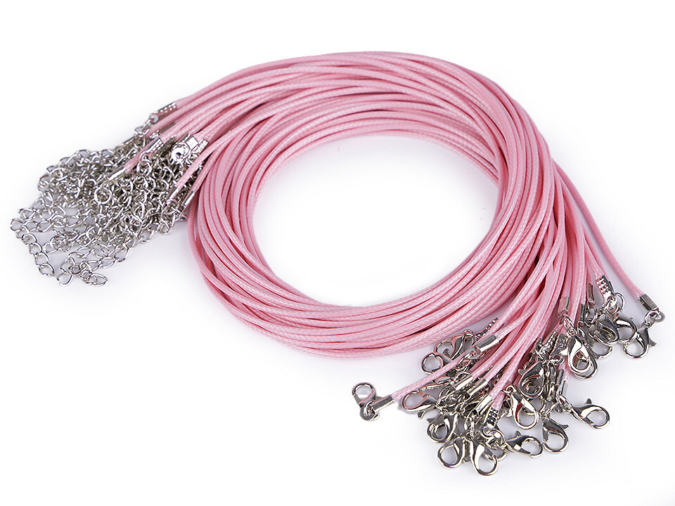 Šňůrka je určená k zavěšení přívěsků. Délka 45 cm + 5 cm adjustační řetízek. Karabinka 5 x 10 mm. Šňůra Ø1,5 mm. V případě, že přívěsek nebude možno díky koncovce navléci, tak lze kleštěmi pružinovou koncovku rozevřít, navléci přívěsek a opět koncovku uzavřít.
