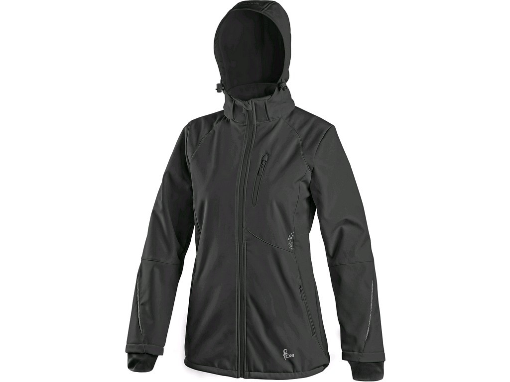 Dámská softshellová bunda s odepínací kapucí, odolná proti vodě a větru, zapínaní na zip, větrání v podpaží, náprsní kapsa na zip, boční kapsy na zip, rukávy s vnitřními manžetami, stahování v dolním okraji, reflexní doplňky, TPU membrána. Odolnost m