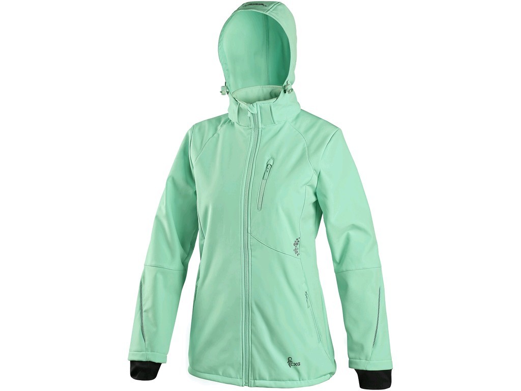 Dámská softshellová bunda s odepínací kapucí, odolná proti vodě a větru, zapínaní na zip, větrání v podpaží, náprsní kapsa na zip, boční kapsy na zip, rukávy s vnitřními manžetami, stahování v dolním okraji, reflexní doplňky, TPU membrána. Odolnost m