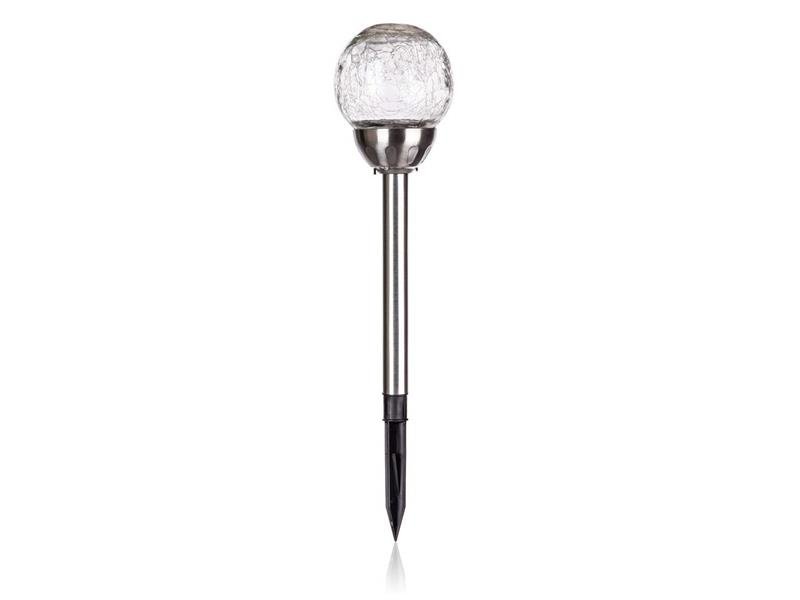 Solární nerezová lampa o výšce 38,5 cm a skleněným dekoračním stínidlem ve tvaru koule s pavučinovým dekorem o průměru 10 cm, je funkční a zároveň ozdobná součást do každé zahrádky. Světelný zdroj - 1 x bílá LED a 1 x barevná LED. Při provozu lze přepínačem zvolit režim svícení buď stabilní bílé barvy, nebo měnící se barevné spektrum. IP 44. Technické parametry: Šířka (cm): 10