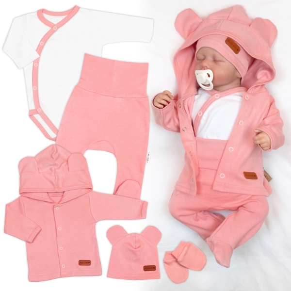 Dopřejte svému děťátku pocit bezpečí a pohodlí s touto pečlivě navrženou sadou, která spojuje kvalitu, praktičnost a roztomilý design. Naše 5dílná souprava je ideální volbou pro první měsíce života vašeho miminka, ať už jako komfortní oblečení doma, nebo jako perfektní výbava do porodnice.