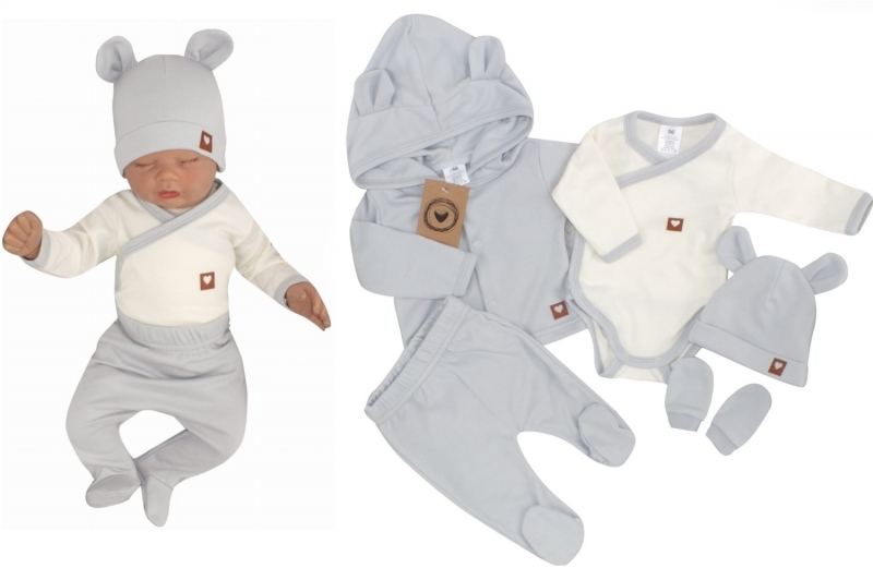 Sada do porodnice 5D, body, polodupačky, kabátek, čepička, rukavičky - šedá, vel. 56; 56 (1-2m)
