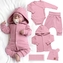 Sada obsahuje: tepláčky, kabátek s kapucí, body zapínání bokem a čepičku.