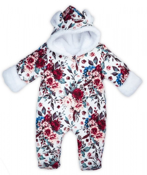 Oteplený kojenecký overal/kombinéza s kapucí, Flowers, bílá/vínová; 68 (3-6m)