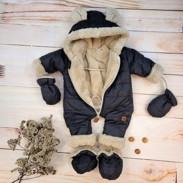 Zimní kombinéza s ozdobným béžovým medvídkem. Součástí jsou rukavice a botičky na šňůrce. Kapuce má okouzlující uši. Uvnitř měkký, teplý kožíšek.