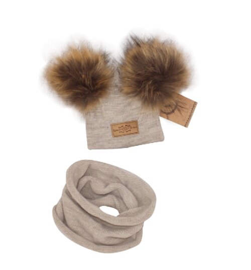 Z&Z Zimní čepice s bambulemi z kožešinky + komínek, béžová, vel. 68/80; 68-80 (6-12m)