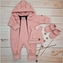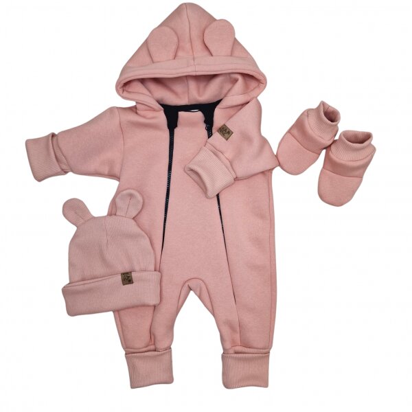 Oteplený dětský overal bez šlapek s kapucí, čepička + botičky, 3D, koralový; 56 (1-2m)