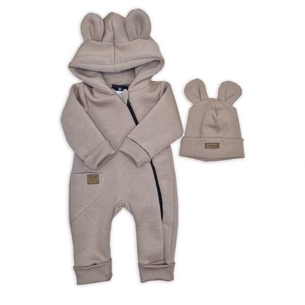 Oteplený dětský overal bez šlapek s kapucí + čepička, 2D, Kazum, cappuccino, 68; 68 (3-6m)