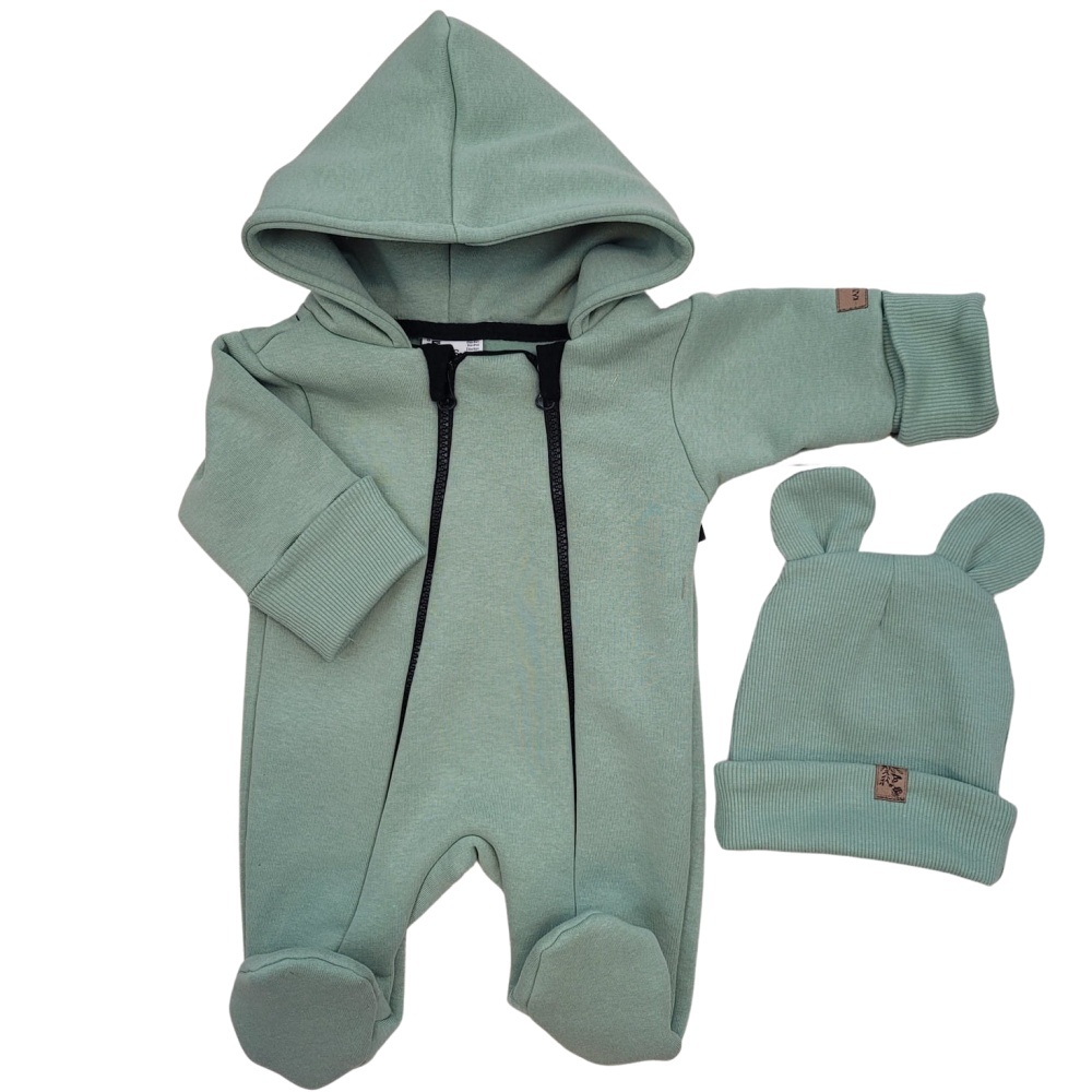 Oteplený dětský overal se šlapkama a kapucí + čepička, 2D, zelená, vel. 68; 68 (3-6m); zelená; bavlna, elastan